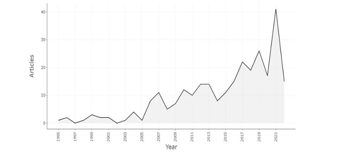 Si bien en el 2017 se publicaron el doble de artículos relacionados con las temáticas evaluadas, con respecto al año 2016, solo 4 años después, en el 2021, se vuelve a duplicar el monto relacionado con la literatura científica a este respecto; de esto y teniendo en cuenta la gráfica presentada en la Figura 2, se puede inferir que se ha ido generando una tendencia de crecimiento más cercana a una función cuadrática que a una función lineal y esto muestra la relevancia y pertinencia de este tipo de estudios en la actualidad. No es desdeñable tener en cuenta la pandemia y la cuarentena sucedida en el año 2020 que llevaron a un crecimiento ostensible de las publicaciones del 2021 en comparación con sus dos años anteriores.