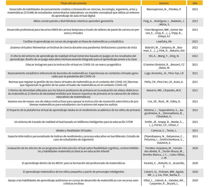 Al abordar los documentos que pasaron los filtros y conformaron el listado reducido, se encuentra una producción notablemente disminuida año a año en comparación con el total de documentos analizados, dado que el tamiz usado restringió la búsqueda a los artículos realizados en las ciencias sociales, en lo relacionado con la enseñanza de las matemáticas utilizando medios virtuales, se hace evidente que son otras áreas del conocimiento, principalmente ingenierías y líneas STEAM las que están generando producción científica en estas temáticas. Adicionalmente, es notable que el crecimiento de los artículos publicados en el 2021, en comparación con los años anteriores, no tuvo un pico que demarcara una situación tan calamitosa y de tanta exigencia para el sector educativo, como fue la enseñanza virtual global, en medio de la cuarentena mundial.