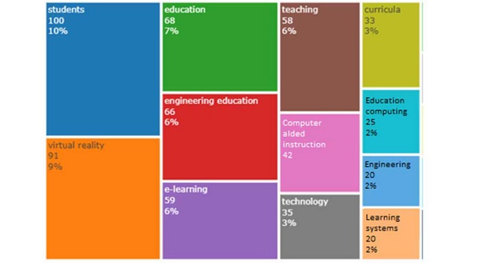 el aprendizaje virtual, la realidad virtual, la computación y la tecnología, que con las ciencias sociales y, lleva a pensar que la enseñanza virtual de las matemáticas se está trabajando más desde la ingeniería y las enseñanzas basadas en STEAM, que en las facultades de educación o en la escuela misma. Es importante aclarar que aunque en el árbol se encontraron otras palabras como steam, child, learning, entre otras; estas no se tienen en cuenta en la Figura 6 porque coincidían en menos del 2% de la literatura revisada.