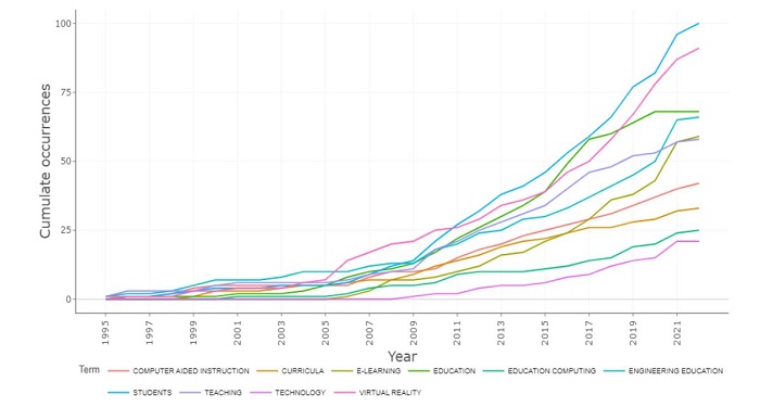 Por último, se hace relevante presentar que el concepto de educación en ingeniería siempre ha estado relacionado, presente y a la vanguardia cuando se habla de enseñanza virtual de las matemáticas como se muestra en la Figura 7, solo en el lustro posterior al 2005, el concepto de Realidad virtual estuvo encabezando la relación con este tipo particular de educación. Para la fase final del estudio, es decir, cuando se cribaron los resultados por el cedazo de las ciencias sociales, no se hallaron coincidencias suficientes como para generar este tipo de gráfica a través del programa.