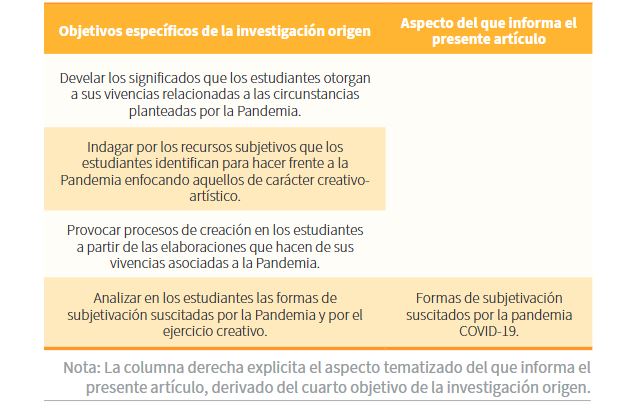 El interés entonces de este artículo es analizar en estudiantes universitarios las formas de subjetivación suscitados por la pandemia COVID-19, análisis que corresponde a uno de los objetivos específicos de una investigación que indaga por las formas creativas de hacer frente a la pandemia por COVID-19 la cual se lleva a cabo entre 2021 y 2022 (ver Tabla 1). Este ejercicio investigativo aporta comprensiones y elaboraciones respecto a las vivencias de los estudiantes con relación a la pandemia y al fenómeno del encierro asociado a la misma.