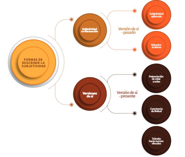 La información por el virus COVID-19 ya no representa lo mismo en materia de noticia, o por lo menos, no de la misma manera como sí tuvo relevancia para el año 2020. Sin embargo, lo que sigue siendo hoy fundamental y novedoso son los impactos generados a raíz de la situación de confinamiento y las reacciones ante una situación de encierro que tomó por sorpresa a la humanidad. En esta contingencia, los estudiantes que participaron de este estudio no fueron ajenos. A partir de la tematización de sus relatos se logra evidenciar que la pandemia les enfrentó a dos situaciones referidas a su subjetividad: por una parte, a una enorme variabilidad de la vivencia emocional (subjetividad en fluctuación);y, por otra parte, a una fuerte transformación en la manera de verse a sí mismos (las versiones de sí) (Ver Figura 1). En este artículo se comparte la tematización orientada a la potencia de estar a solas y la conciencia de finitud como expresiones de una versión de sí-presente.