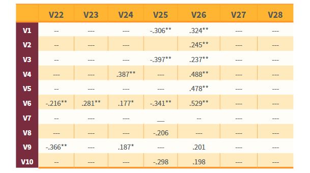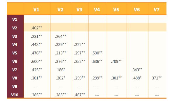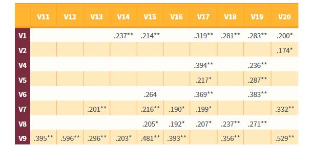La Tabla 2 muestra las relaciones lineales estadísticamente significativas, altas y directamente proporcionales entre la variable Me gustan las matemáticas y las variables Me gusta la clase de matemáticas, Matemáticas es la materia que me gusta más y Las matemáticas son divertidas. Asimismo, se observan siete relaciones lineales estadísticamente significativas, moderadas y directamente proporcionales, de las cuales cuatro son entre la variable Me gusta la clase de matemáticas y las variables: La clase de matemáticas es aburrida, Matemáticas es la materia que me gusta más, Las matemáticas son divertidas y Es importante aprender matemáticas. Asimismo, se observa la relación en tres variables más: la variable Las matemáticas son difíciles y la variable Tengo dificultad para entender lo que me pide el profesor en las actividades de matemáticas; la variable Matemáticas es la materia que me gusta más y la variable Las matemáticas son divertidas; y, finalmente, la variable Me gustan las matemáticas con la variable Me gustaría utilizar las matemáticas cuando ingrese a trabajar.
