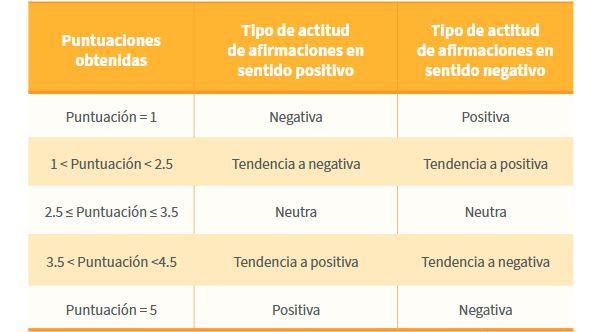 Para ello se utilizó la clasificación propuesta por (Ursini y Sánchez, 2019), la cual sugiere que la puntuación obtenida en los ítems cercanos o iguales a 5, indique una actitud con tendencia positiva, una puntuación cercana o igual a 3, indique una actitud neutra y una puntuación cercana o igual a 1, sea una actitud con tendencia a negativa. Tabla 5