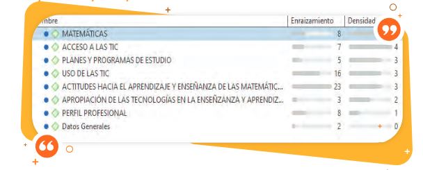 Para este análisis, se asignaron los códigos correspondientes a las siete categorías de la entrevista semiestructurada para generar un administrador de códigos que permitiera clasificar por categoría -códigos-- la densidad de las ideas expresadas por la profesora entrevistada.
