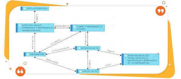 La Figura 2 muestra la red semántica obtenida en el presente estudio, la cual consiguió la vinculación -nodos y preposiciones- de las categorías del estudio con las ideas expresadas por la profesora entrevistada. Esto nos permitió establecer que existe una relación entre el perfil profesional de la profesora con las actitudes hacia las matemáticas y el uso de las tecnologías, además de la gran influencia que tiene el acceso de los recursos tecnológicos con el uso de las tecnologías en el aula de matemáticas. Finalmente, también permitió percibir la correspondencia entre las actitudes hacia las matemáticas y las actitudes hacia las matemáticas con el uso de la computadora como factor influyente en la apropiación del conocimiento tecnológico de la enseñanza y aprendizaje de las matemáticas.