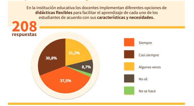 La intención de abordar los ítems de estudio propuestos fue obtener información sobre la postura de la institución escolar frente a la didáctica empleada por el profesorado y el manejo de recursos para el desarrollo de sus prácticas, información que resulta relevante en línea con lo planteado por Booth et al. (2000) para quienes “La inclusión implica identificar y minimizar las barreras para el aprendizaje y la participación y maximizar los recursos que apoyen ambos procesos” (p. 22), reconociendo con esto que al profesorado no le es fácil desarrollar en sus estudiantes competencias para trabajar en equipo en virtud de la cantidad y diversidad de los mismos que integran las aulas regulares.