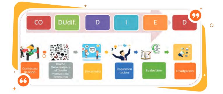 Ahora bien, la creación de Recursos Educativos Digitales Dualizados (REDDUA) se puede entender a partir de lo propuesto, entre otros, por Sánchez et al. (2013) quienes indican que es “De especial interés en el campo del DUA el uso de la tecnología como medio para favorecer la flexibilidad en los objetivos, los contenidos, los materiales y la evaluación” (p. 7); que dichos recursos sean desarrollados desde el diseño instruccional CODUDIED se valida al considerar que los pasos que este propone favorecen y apoyan los procesos de aplicación por parte del profesorado y los procesos de aprendizaje del lado de los estudiantes.