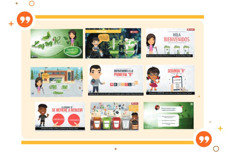 Fase 3 Aplicación. El resultado de esta fase fue el OVA denominado “Las tres R”, cuya interfaz se muestra en la Figura 4, el cual se presentó en un escenario escolar en situaciones propias de dicho contexto frente al manejo de residuos. En cuanto a su implementación se emplearon colores neutros, así como un mapa de navegación intuitivo apoyado por audio al contacto con el cursor; para verificar el nivel de comprensión frente a la clasificación de residuos apoyados en Las Tres “R” se empleó una estrategia de tipo juegorecompensa con la intención de mantener la motivación de los estudiantes.