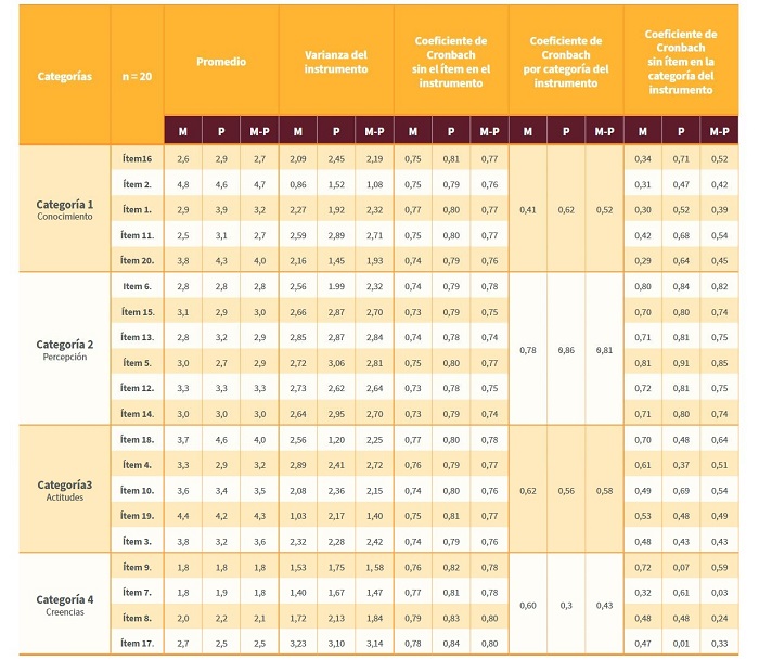 Etapa cuatro, estabilidad del instrumento y fiabilidad del ítem por exclusión. En esta etapa se involucró el cálculo del coeficiente de Cronbach a través de valores cuantitativos asignados a la tendencia de la escala (1= totalmente en desacuerdo; 2 = en desacuerdo; 3 = indeciso; 4 = de acuerdo; 5 = totalmente de acuerdo) de los 20 ítems en ambos parentales, papás y mamás. Los valores de los coeficientes fueron mayores a la construcción previa del instrumento (ambos parentales M-P α = 0,78; papás P α = 0,81; mamás M α = 0,77). Y en fiabilidad del ítem se hallaron valores del coeficiente por encima de los valores mayores a los del instrumento, pero no repercuten en la eliminación, puesto que ninguno de estos tuvo diferencia mayor a una décima (0,1); tal como se indica en la tabla 1.