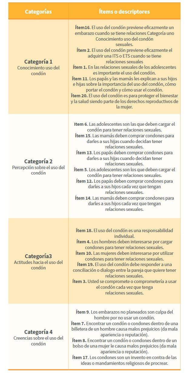 Presentación del instrumento final. Este instrumento consta de cuatro categorías, las cuales son: categoría uno “Conocimiento uso del condón”, categoría dos “Percepción sobre el uso del condón”, categoría tres “Actitudes hacia el uso del condón” y categoría cuatro “Creencias sobre el uso del condón” (ver tabla 2).