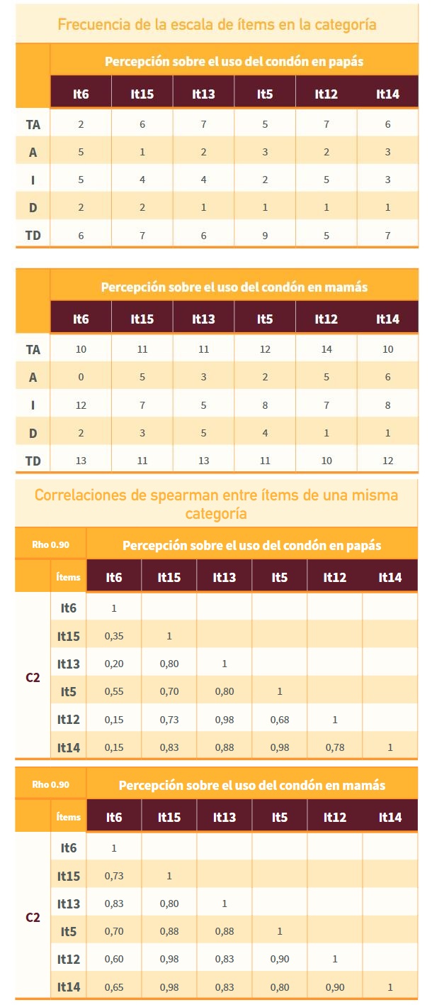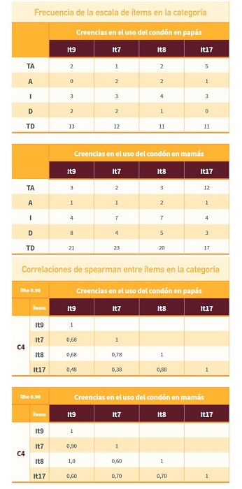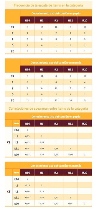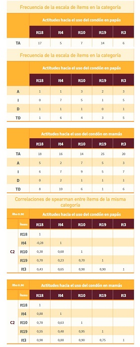 Mientras, los datos de las mamás en la categoría uno no hay correlaciones Rho ≥ 0,90. En la revisión de la tendencia de frecuencia se identifica que más de la mitad de las mamás entrevistadas (23 de 38) saben que el uso del condón es para proteger el bienestar y la salud y es parte de los derechos reproductivos de la mujer (it20) y favorabilidad en it1 (en las relaciones sexuales de los adolescentes es importante el uso del condón). Además, una tercera parte tiene conocimientos sobre la función que cumplen los condones posibilitándolas para dar explicaciones sobre la importancia de su uso (ver tabla 3).