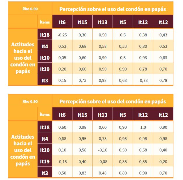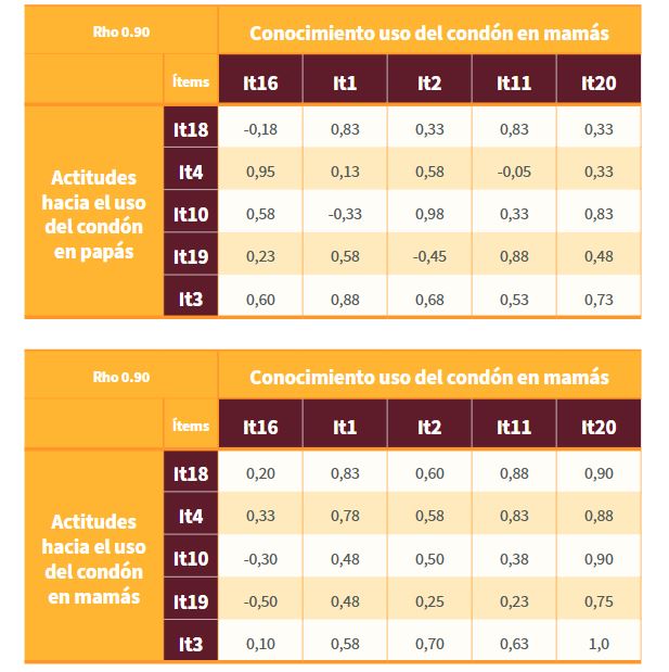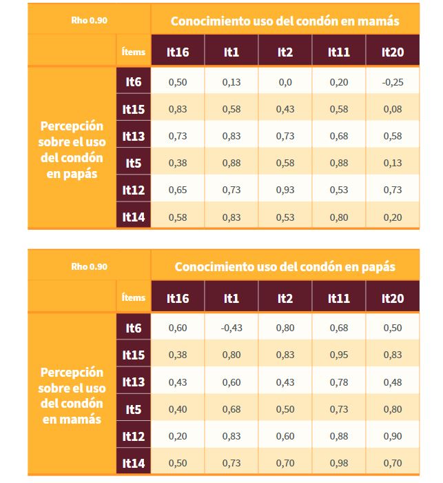 Adicionalmente, este diseño metodológico determinó la cantidad de ítems correlacionados dentro de las categorías y entre categorías, las cuales fueron diferentes entre parentales, en cuanto a ítems y valores de Rho. De tal modo, en el grupo de los papás se hallaron seis correlaciones dentro de las categorías (dos en cada una de las categorías: conocimiento, percepciones y actitudes) y ocho correlaciones entre ítems de diferentes categorías. Mientras, en el grupo de mamás se hallaron nueve correlaciones (cuatro en percepción, tres actitudes y dos en creencias y sin correlaciones en la categoría conocimiento bio-sexualidad sobre el condón) y quince correlaciones entre los ítems de diferentes categorías. Además, se identificó en ambos géneros, mayor cantidad de ítems correlacionados (cinco en papás y siete en mamás) entre las categorías “percepción sobre el uso del condón” y “actitudes hacia el uso del condón”.