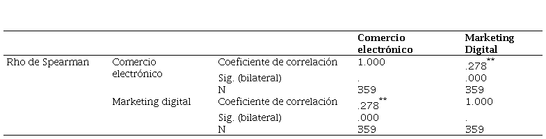Considerando el rigor de calidad requerido por el paradigma cuantitativo, el cuestionario del estudio superó la prueba de validez a través del juicio de expertos, el cual a su vez fue calificado como aplicable. Se obtuvo un resultado de 0,872 para la variable comercio electrónico y de 0,868 para la variable de marketing digital, los cuales fueron congruentes a un nivel de confiabilidad muy alto. Para determinar la normalidad se utilizó la prueba estadística de Kolmogórov-Smirnov, cuyo valor de significancia fue menor al valor teórico de 0.05, por tal razón, para el contraste de las hipótesis se utilizó la prueba no paramétrica de relación de Spearman. Motivo por el cual, se aceptó la hipótesis general de la investigación y se rechazó la hipótesis nula. Luego de contrastar cada una de las hipótesis específicas, en cada una de ellas los resultados de la relación fueron menores a 0,499 con un margen de error al 5% y un nivel de confianza al 95%.