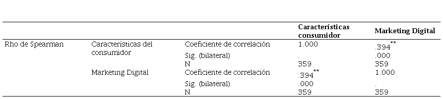 Seguidamente, conforme se refleja en la tabla 2, en la investigación se determinó que la dimensión, características del consumidor tiene una relación de 0.394 con la variable marketing digital, siendo una correlación positiva baja. En congruencia, Ordoñez et al. (2021) encontraron en su estudio que el acto de compra de productos en línea está supeditado a la actitud, conocimiento y creencias de los consumidores. En complemento a ello, Cho et al. (2022) identificaron que los esfuerzos de marketing digital en entretenimiento, interacción, tendencia, personalización y compromiso visual conllevan a beneficios en términos de satisfacción e intención de volver a comprar. Los resultados encontrados en la pesquisa ayudan a comprender cómo influyen las variables psicológicas en la toma de decisiones de compra y cómo el marketing digital puede aprovechar esas características para influir en el comportamiento del consumidor. En atención a lo cual, al profundizar el estudio de las variables y recurrir a la revisión de la literatura especializada se toma una postura dilemática considerando la potencialidad que posee el marketing digital al momento de predecir comportamientos y dirigir estrategias, eventualmente poco altruistas, que en efecto demandan de experiencias positivas y sólidas, hecho crucial cuando existen vacíos y falta de información para regular su práctica ética.