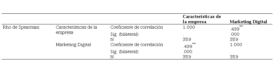 Luego, a tenor de la información proporcionada en la tabla 3, en la investigación se comprobó que la dimensión característica de la empresa tiene una relación de 0.499 con el marketing digital; resultando una correlación positiva moderada. En correspondencia, Murcia (2022) identificó que la adopción de estrategias digitales está vinculada al tamaño de la empresa, ya que empresas de mayor envergadura tienden a contar con recursos financieros y humanos que favorecen su adopción. A diferencia de Wasiq et al. (2022) quienes hallaron que, si bien los usuarios están familiarizados con los servicios de comercio móvil para adquirir bienes y servicios, la frecuencia de uso es menor con respecto a las compras realizadas a través de tiendas minoristas o centros comerciales.