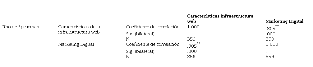 Consecutivamente, como puede apreciarse en la tabla 4, en la investigación se observó que la dimensión característica de la infraestructura web tiene una relación de 0.305 con la variable marketing digital; concurriendo una correlación positiva baja. Gunawan et al. (2021) determinaron que el diseño de la infraestructura web es importante para que un sitio de comercio electrónico funcione, ello bajo el parámetro de practicidad en su uso, impactando en la experiencia del usuario. Acosta-Vargas et al. (2022) identificaron que el principal desafío de accesibilidad en los sitios web de comercio electrónico está relacionado con errores de contraste los cuales deben corregirse para alcanzar un nivel adecuado de accesibilidad. En complemento a ello, Guo et al. (2023) evidenció que el 83,3% de la lealtad del consumidor online se explica por la satisfacción en el uso del sitio web. Los resultados levantados del estudio están vinculados con lo planteado por Chen y Dhillon (2003) en su modelo teórico, pues ambas variables afectan de manera indirecta en la percepción y experiencia del consumidor en línea. A partir del análisis de las variables y dimensiones se toma una postura pragmática que sugiere la implementación de estrategias y tácticas centradas en el usuario al momento de diseñar la interfaz de usuario en aras de mejorar significativamente la experiencia y eliminar cualquier fricción en el proceso de navegación y compra, la cual debe ser susceptible de mejoras, en pro de establecer una conexión más profunda y significativa entre empresas y consumidores.