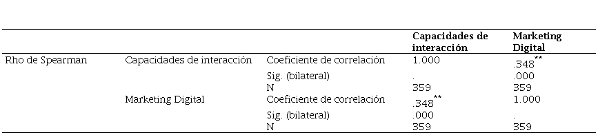 En consonancia con lo representado en la tabla 5, en la investigación se estableció que la dimensión capacidades de interacción tiene una relación de 0,348 con el marketing digital; siendo una correlación positiva baja. Al respecto, Dewi y Hartono (2019) hallaron que las capacidades de interacción online están vinculadas a las estrategias promocionales dado el atractivo para los usuarios de la mixtura de precio, descuentos, variedad y rapidez entrega. De manera complementaria, Candia (2021) encontró evidencia de la relación positiva entre la calidad de servicio online, uno de los aspectos de la interacción, y la satisfacción del cliente, uno de los objetivos del marketing digital. Los resultados encontrados se encuentran relacionados con lo propuesto por Don Peppers y Martha Rogers en la teoría del marketing relacional, que postula la importancia de la comunicación bidireccional y de la atención efectiva al cliente. A partir del análisis del estudio de las variables se infiere que existe una relación positiva entre las capacidades de interacción y el marketing digital con argumentos teóricos y prácticos que la sustentan, sin embargo, se toma una postura pragmática que sugiere ahondar en la investigación centrada en la experiencia del usuario y a la naturaleza del negocio, para construir una conexión más fuerte empresa-cliente.