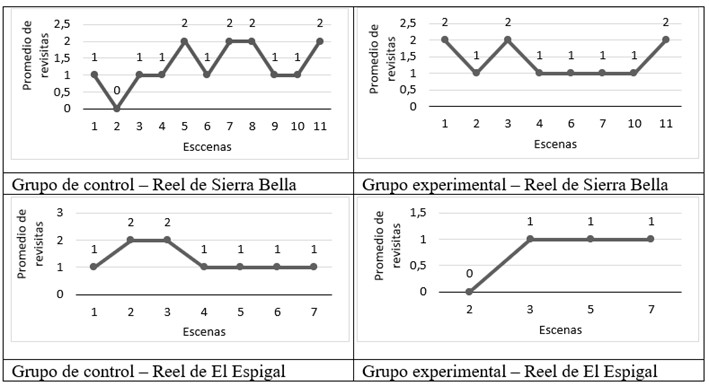Ambos grupos al visualizar el reel de la cafetería Sierra Bella arrojaron un promedio de entre 1 y 2 revisitas. Sin embargo, el grupo de control presentó ausencia de revisitas en la escena 2 (dosificación del café), lo cual no sucede en el grupo experimental. El grupo de control mantiene constantes subidas y bajadas en los resultados de las revisitas, a diferencia del grupo experimental que generó los picos más relevantes en las escenas de 1 (portafiltro), 3 (compactación del café) y 11 (información de contacto). Por otro lado, en el reel de la cafetería El Espigal las escenas 2 (espumador de leche) y 3 (leche) generaron el mismo promedio de revisitas en el grupo de control. El grupo experimental inició con la ausencia de revisitas, sin embargo, obtuvo una elevación de 1 revisita en las próximas escenas.