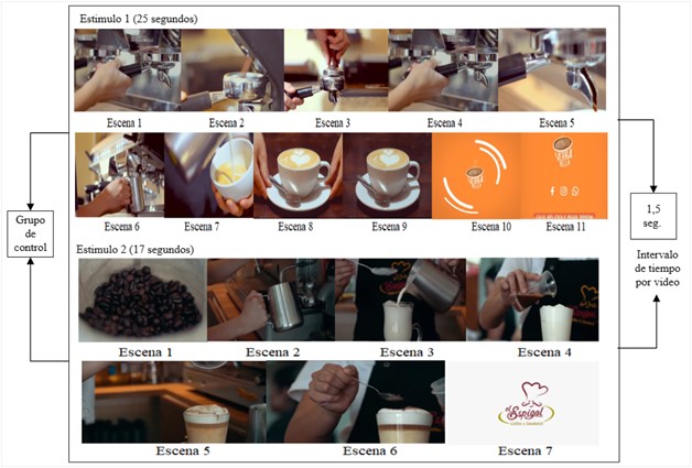 Se utilizó 10 reels de 4 a 11 escenas acerca de la elaboración de un cappuccino, los estímulos fueron obtenidas de los perfiles de Instagram de las marcas (Sierra Bella, Amaretto, El Espigal, Simona Café, Macarron’s Cafetería, Chocolate, Ponche Suizo, Contraste, Comma de todo y Ponchecitos) de las cafeterías de la ciudad de Ambato-Ecuador.