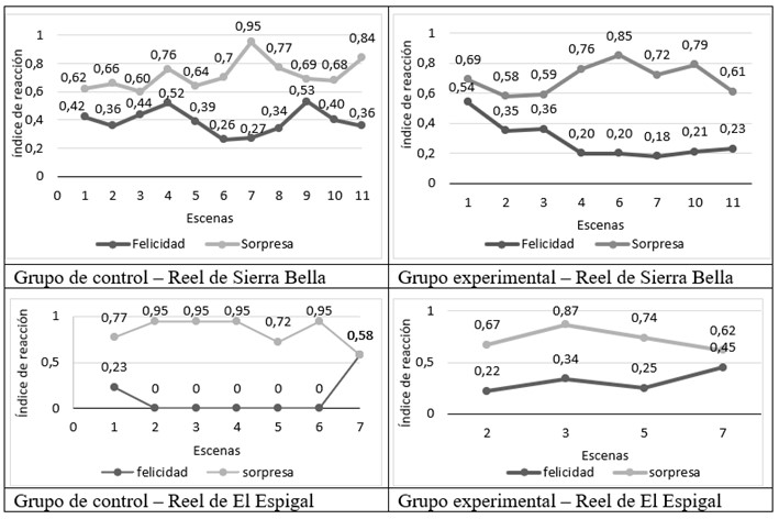 En cuanto al reel de El Espigal se obtuvo un resultado favorable de reacción de sorpresa en el grupo de control, pues mostró índices altos con una leve caída en las escenas 5 (cacao en polvo) y 7 (logotipo). Por otro lado, para el grupo experimental el mayor índice de sorpresa se produjo en la escena 3 (leche). El grupo de control presenta dos índices de reacción de felicidad en las escenas 1 (granos de café) y 7 (logotipo) siendo esta última la más relevante. En contraste a esto, el grupo experimental inició con un bajo índice de reacción de felicidad y al llegar a escena 7 (logotipo) se obtiene el mayor índice de reacción.