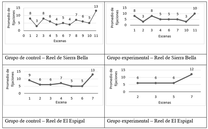 Tanto el grupo de control como el de grupo experimental en el reel de la cafetería Sierra Bella presentaron un mayor promedio de fijaciones al observar las escenas 1 (portafiltro), 3 (compactación del café) y 11 (información de contacto), así mismo, para ambos grupos se vio una notable caída de interés en la escena 2 (dosificación del café). Se observó un promedio alto en el número de fijaciones en la primera escena del reel de la cafetería El Espigal por parte del grupo de control, sin embargo, se produjo una caída en las escenas posteriores, sin embargo, el interés se recuperó en la escena 7 (logotipo) por parte de ambos grupos.