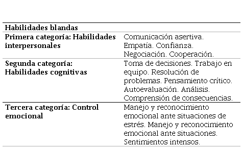 Finalmente, a modo de resumen, en la Tabla 1 se presenta la clasificación de las habilidades blandas que se tendrán en cuenta para el desarrollo de esta investigación.