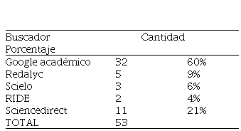 De tal forma que en la base de datos para la revisión documental quedan en total 63 documentos distribuidos de la siguiente forma, 32 de Google académico, 5 de Redalyc, 3 de Scielo, 2 de RIDE y 11 de Sciencedirect como se puede ver a continuación en la Tabla 2.