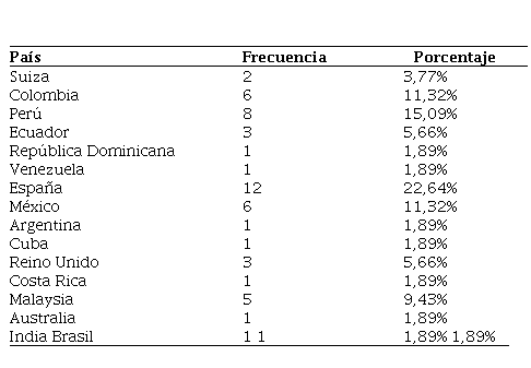 Con relación a la Tabla 3 se observa que el país con más documentación encontrada con respecto al tema de investigación es España con un porcentaje de 22,64%. Otro país con alta aportación en investigación es Perú con un porcentaje de 15,09%. En Colombia se encuentra un porcentaje del 11.32%.