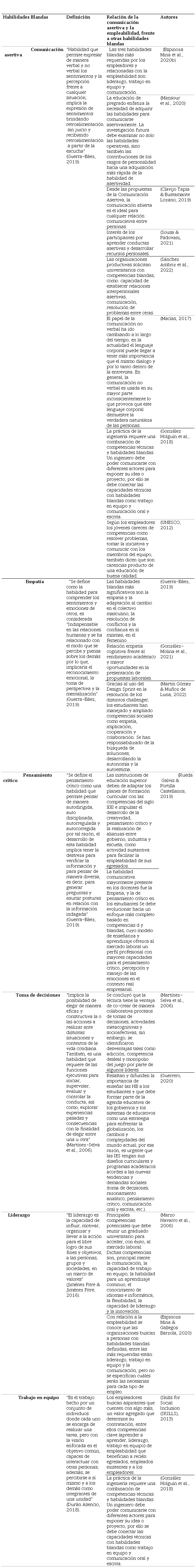 La revisión bibliográfica muestra un notorio interés en la necesidad de complementar la formación de personas en habilidades de comunicación que hacen parte de las habilidades blandas, siendo estas, aquellas que van más allá del aprendizaje de un contenido específico y son las que sirven para la vida (Espinoza Mina et al., 2020a). El futuro profesional se enfrenta a un ámbito empresarial en que debe poner en práctica no solo su conocimiento específico en habilidades duras, también las habilidades que le permitan trabajar en equipo, tener control de sus emociones, comunicación efectiva o las llamadas habilidades blandas (Sánchez et al., 2018). Por esta razón para que el profesional este en la capacidad de enfrentar el ámbito laboral de forma integral y tengan mayores posibilidades de acceder a un empleo, las instituciones educativas deben brindar al estudiantado herramientas que permitan fortalecer las diferentes habilidades blandas además de dar información sobre las habilidades y competencias demandadas por el sector productivo.