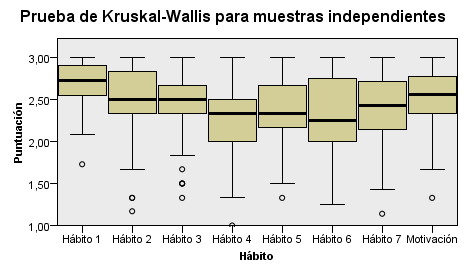 Si bien es cierto, como se puso de manifiesto en el inciso anterior, la diferencia entre cada uno de los hábitos junto con la motivación intrínseca para el aprendizaje de los universitarios en condición de vulnerabilidad socioeconómica es mínima; de acuerdo a la prueba de Kruskal Wallis (Tabla 3), dicha disimilitud es estadísticamente significativa, a razón de que, el p-valor (significancia asintótica) fue de 0%, que al postularse por debajo del umbral del 5%, rechaza hipótesis nula de la no existencia de diferencias estadísticamente significativas. En el mismo sentido, como se atisba en la Figura 1 del diagrama de cajas y bigotes, todos los hábitos y la motivación intrínseca, se posicionan diferentes entre sí. Sin dejar de lado la presencia de datos u observaciones atípicas y la variabilidad entre un hábito y otro.
