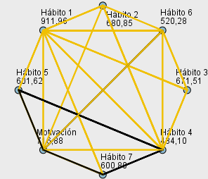 A vista de lo anterior, para observar con detenimiento donde radican las diferencias entre los siete hábitos de estudios y la motivación intrínseca para el aprendizaje en los universitarios vulnerables, se aplicó la prueba gráfica post hoc Dunn-Bonferroni (Figura 2), la cual consiste en una comparación no paramétrica para pruebas post hoc después de realizar una prueba de Kruskal-Wallis (García et al., 2017). Donde, los nodos que se unen con línea amarilla son los que mantienen diferencias significativas (p-valor < 5%); mientras que, los nodos que se unen con líneas negras no presentan pruebas suficientes para diferenciarse estadísticamente (p-valor >5%).