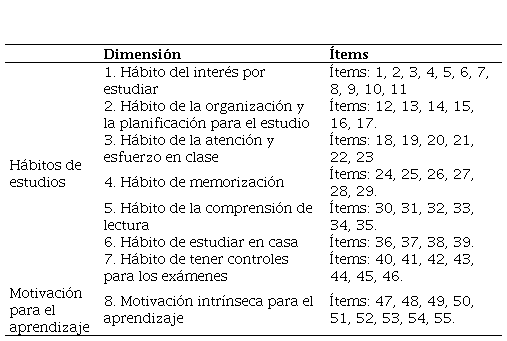 Se utilizó el instrumento de "Hábitos de estudios y motivación para el aprendizaje" desarrollado por Hernández et al. (2012), que evalúa ocho dimensiones distintas a través de 55 ítems. Estos ítems fueron medidos en una escala Likert de tres puntos: 1 = bajo, 2 = medio, 3 = alto. La confiabilidad del instrumento se verificó utilizando la prueba Omega de McDonald (Hayes, 2020), obteniendo un valor de 0.937, lo que indica una alta confiabilidad según los criterios de Ventura-León y Caycho-Rodríguez (2017), quienes sugieren que un valor superior a 0.70 es considerado óptimo.