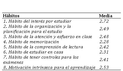 En torno al valor medio de las puntuaciones de las dimensiones del cuestionario aplicado a la muestra de interés (Tabla 2); se observa que la diferencia entre ellos es mínima; puesto que, el valor menor que lo presenta el hábito 4 (memorización) fue de 2.28 y el mayor, dado por el hábito 1 (interés por estudiar) fue 2.72. Además, se puede observar que los hábitos 2 (organización y planificación para el estudio), 3 (atención y esfuerzo en clases), 5 (comprensión de lectura) y 7 (tener controles para los exámenes) manifiestan valores promedios similares que bordan los 2.40 puntos. Situación que se repite para el caso de la motivación intrínseca para el aprendizaje, al tener un valor medio de 2.53.
