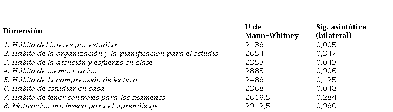 En lo que respecta al sexo de los individuos analizados, la prueba U de Mann-Whitney tal como se aprecia en la Tabla 4, arrojó que, de los diferentes hábitos de estudios y la motivación intrínseca para el aprendizaje, solo existen diferencias significativas entre hombres y mujeres en el hábito 1, que evalúa elementos de interés por estudiar, tales como: el gusto por aprender, el entusiasmo del estudiante, sus intereses personales, y el apoyo por parte de sus familias y maestros; en el hábito 3, que aborda factores de la atención y esfuerzo y clase (Herrmann et al., 2019), como: la atención a las explicaciones en clase, la toma de apuntes y la evitación de distracciones; y el hábito 6, que comprende aspectos del estudio llevado a cabo en caso, como por ejemplo: limpieza y orden de la habitación, tiempo, organización y ampliación del conocimiento con texto complementarios (Oga-Baldwin y Nakata, 2017).