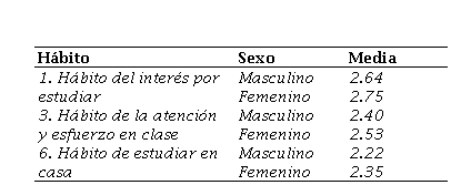 De forma pormenorizada, la Tabla 5, dispone que, la diferencia en términos medios en los hábitos 1, 3 y 6 por sexo a posteriori de la prueba U de Mann-Whitney, se da a favor por mayor puntuación hacia las féminas Bonneville et al., 2017). Es decir, que, en los hábitos del interés por estudiar, atención y esfuerzo en clases, y de estudiar en casa, pese a la vulnerabilidad socioeconómica, son las mujeres que resaltan con un mayor puntaje (aunque no distante) versus a los hombres.