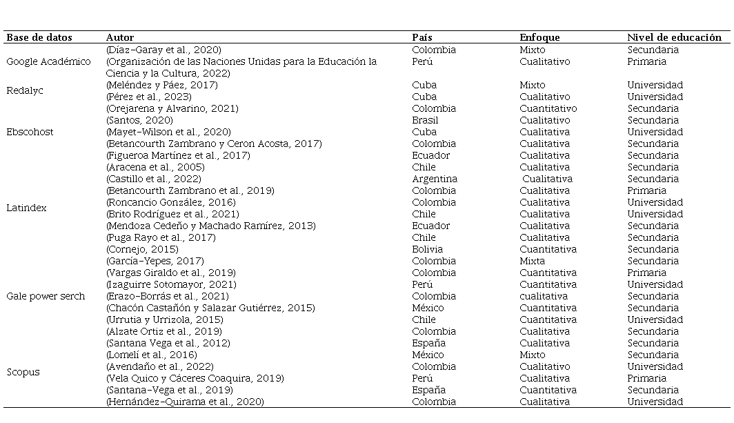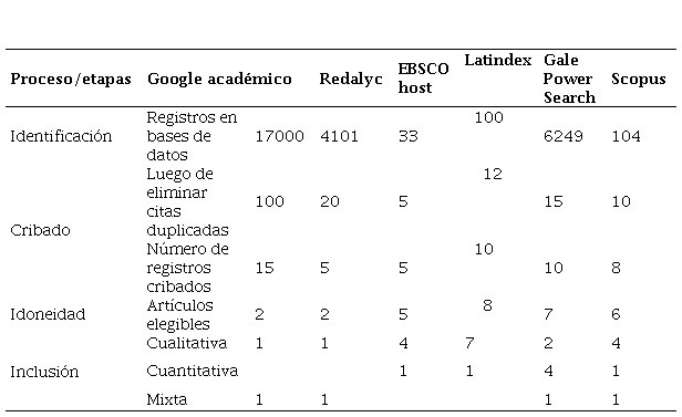 Para la revisión bibliográfica se realizó una búsqueda exhaustiva en las siguientes bases de datos: Google académico, Redalyc, EBSCO host, Latindex, Gale Power Search, Scopus y RRAAE, por ser las más utilizadas en la región latinoamericana. A partir de aquello, para identificar el mayor número de investigaciones se utilizó el operador BOOLEANO “AND” (Avelar-Rodríguez y Toro-Monjaraz, 2018), de esta forma se logró incluir todas las investigaciones relacionadas con “proyecto de vida", "instituciones educativas", "educación".