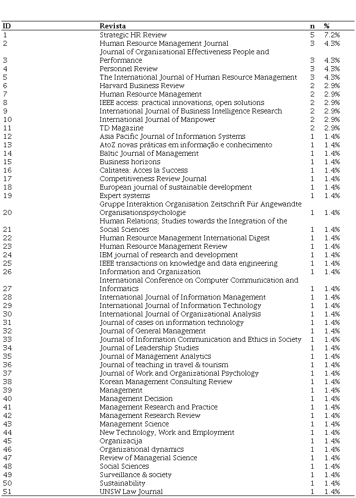 Fue así como, siguiendo una serie de procedimientos estrictos y definidos, se realizó la revisión de literatura acerca de la analítica de RRHH, incluyendo artículos, publicados entre el año 2010 y 2023. En primer lugar, se hizo una búsqueda rigurosa en bases de datos científicas, en las cuáles se incluyen Web Of Science, SciELO, ProQuest, Elsevier y Researchgate. La búsqueda se realizó durante la primera quincena del mes de enero del año 2023, para lo cual se emplearon las siguientes palabras clave: human resource analytics, HR analytics, people analytics, talent analytics, workforce analytics; en: Titulo (title) OR Resumen (abstract) AND Idiomas: inglés AND Año: 2010-2023 AND Tipo de documentos: artículos de investigación (Research articles). En segundo lugar, se seleccionaron 69 documentos que cumplían con los criterios de inclusión, es decir, contaban con relevancia temática, rigurosidad metodológica y eran de acceso abierto o disponible. En tercer lugar, se evaluó la calidad de los artículos, es decir, si estos cumplían con los criterios para el análisis. Finalmente, los hallazgos se recopilaron e interpretaron de manera sucinta, reportando las revistas y los artículos analizados (ver Tabla 1), los métodos de investigación, las técnicas estadísticas, los principales tópicos, por áreas y periodo y los autores más prolíficos.