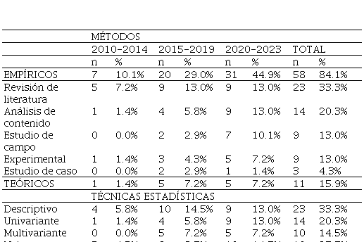 En el marco temporal del estudio, según un análisis por periodos, en todos los periodos destaca la revisión de literatura como el método más utilizado (33.3%), sin embargo, es en los períodos 2015-2019 y 2020-2023 en los cuáles el análisis de contenido (20.3%), los estudios de campo (13.0%) y los estudios experimentales (13.0%) empiezan a tener mayor prevalencia.