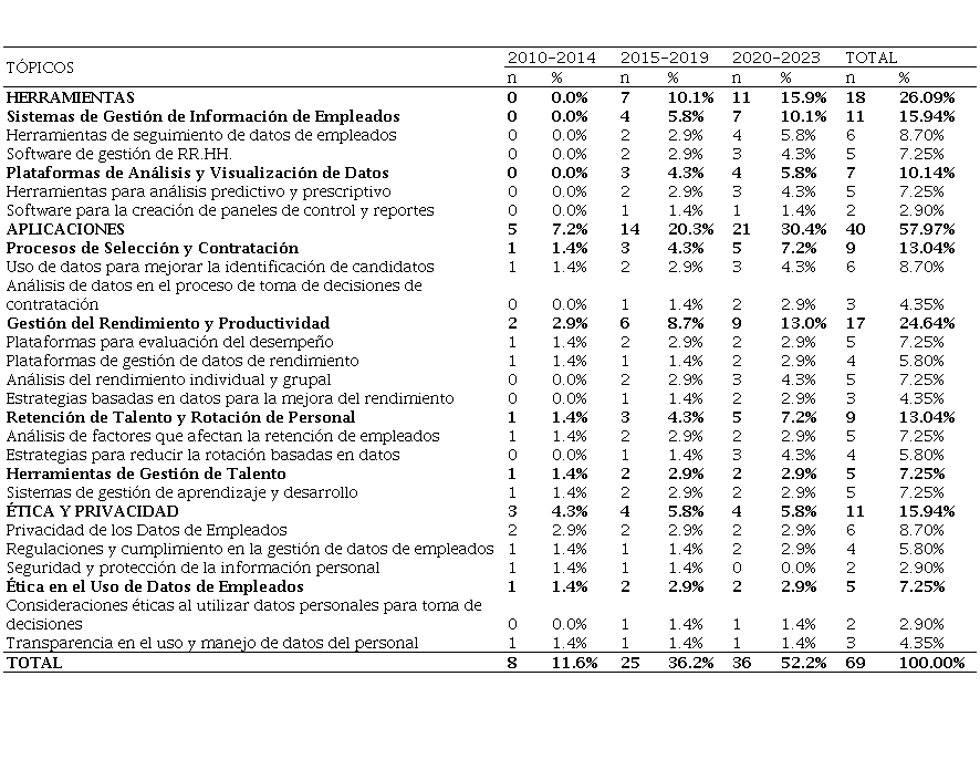 En el análisis de 69 artículos científicos sobre analítica de RRHH, se observan tendencias significativas en el enfoque y la evolución de la investigación en diferentes períodos. La tabla 3 presenta las principales áreas y tópicos por periodo: 2010-2014, 2015-2019 y 2020-2023. Se examinan tres aspectos principales: herramientas utilizadas, aplicaciones de la analítica de RRHH y consideraciones éticas y de privacidad.