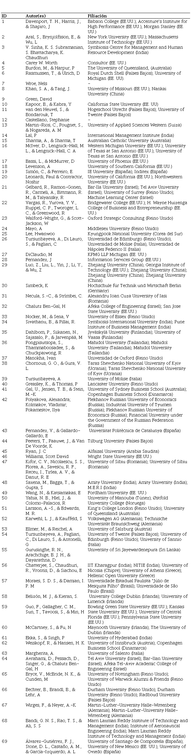 La Tabla 4 muestra a los autores de cada uno de los 69 artículos de esta revisión y sus respectivas filiaciones. El autor más prolífico en cuanto a su contribución por número de artículos publicados es Tursunbayeva con tres artículos publicados, luego, se encuentran Chalutz Ben-Gal, Fernández, Gal, Jensen, Pagliari, Di Lauro y Antonelli, todos ellos con dos publicaciones realizadas. Respecto a las instituciones de filiación de los autores, Zhejiang University (China) y Bowling Green State University (EE. UU.) tienen la mayor cantidad de autores (cuatro autores) que han publicado sobre la analítica de RRHH. De manera similar, otras instituciones como, Mahidol University (Tailandia), y Tel Aviv University (Israel) también tienen múltiples autores (tres autores) que han publicado en este campo. Otras instituciones que tienen al menos dos autores que han publicado artículos relacionados a esta temática son University of Twente (Países Bajos), Symbiosis Centre for Management and Human Resource Development (India), University of Molise (Italia), Taras Shevchenko National University of Kyiv (Ucrania), Universitat Politècnica de Catalunya (España), University of Sibiu (Romania), Amity University (India), University College Dublin (Irlanda), University of Innsbruck (Austria), University of Nottingham (Reino Unido), Durham University (Reino Unido), Martin-Luther-University Halle-Wittenberg (Alemania), Marri Laxman Reddy Institute of Technology and Management (India) y la Universidad de Santiago de Compostela (España). Estos hallazgos sugieren la relevancia y la contribución significativa de ciertas instituciones en la investigación y publicación de estudios relacionados con la analítica de RRHH.