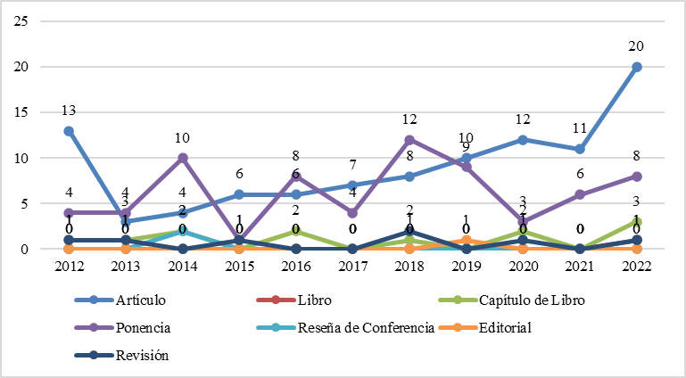 El número de publicaciones por año de acuerdo al tipo de documento científico, puede evidenciar que existe mayores publicaciones sobre el tema de modelo de gestión del conocimiento en el año 2012 con un total de 13 publicaciones de artículos; además a partir del 2019, 2020, 2021 y 2022 un total de 10, 12, 11 y 20 publicaciones respectivamente; con respecto a Ponencias existió mayor publicación, 10 en el año 2014 y 12 artículos en el año 2018; en los otros tipos de documentos en el periodo del año 2012 al 2022 sus publicaciones fluctúan entre 1 a 9 publicaciones, ver Figura 1: