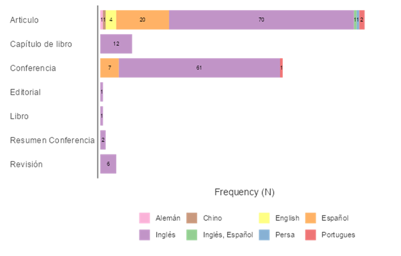 El número de publicaciones de diferentes tipos de documentos científicos varía según el idioma y la editorial que publica. Se puede observar que hay más publicaciones en inglés para artículos, capítulos de libros, ponencia y revisión. Le sigue el español en la publicación de artículos y ponencia.