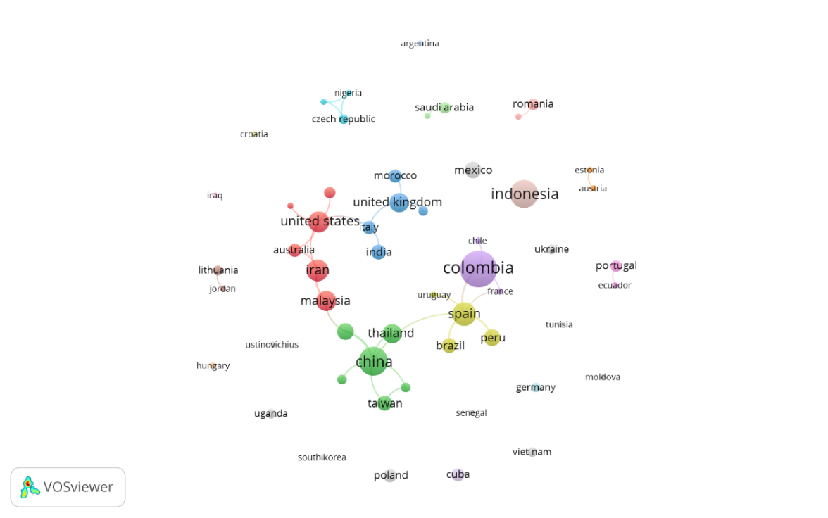 Para la elaboración de la red de coautoría por país, se consideró como tipo de análisis coautoría; su unidad de análisis países, el método aplicado conteo completo. Además, se consideró como número máximo de países por documento: 25; para el mínimo de número de publicaciones que debe tener un País para ser incluido en la red de coautoría: 1; dando como resultado 54 países que cumplen el umbral; los cuales el programa VOSviewer numera los 54 países incluidos en la red y da la posibilidad de eliminar países individuales de la red, en este caso, se eligió no eliminar a nadie. Finalmente se consideró en el parámetro de Distribución de atracción se contempló el valor de 2 y en repulsión se ajustó con el valor de -2.