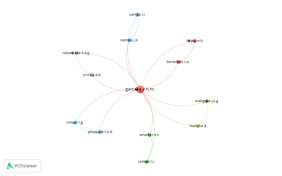 La red de coautoría bibliográfico es una de las metodologías que se aplican para analizar los rasgos de similaridad temática entre documentos, determinando las relaciones que existen entre ellos a partir de la aparición conjunta de las citas y referencias, ya sean estos por autores, organizaciones o países, así como aquellas relacionadas con campos de investigación o enfoques metodológicos (Abadía, 2023). También permite hacer un análisis cuantitativo de las relaciones que hay entre los miembros de una red, como es el caso de una red de colaboración científica (Fabila L. y Fabila R., 2023). Según Donthu et al. (2021) el análisis cuantitativo permite identificar que tan conectada está la red, a través del análisis de citas y sus unidades de publicación.