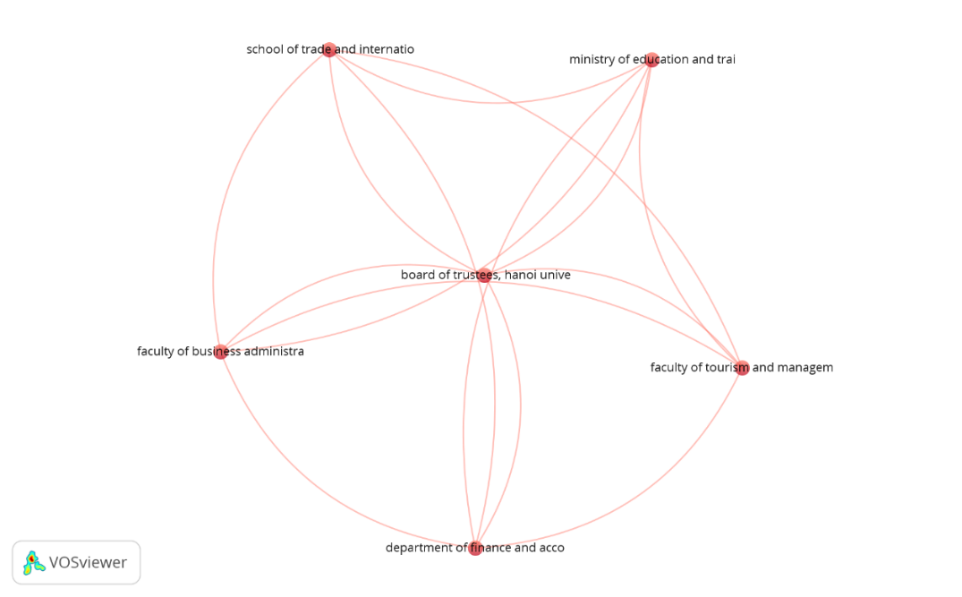 En la Figura 5 se muestra la visualización de coautoría entre organizaciones, se consideró mostrar las organizaciones que se encuentran conectadas estas son Junta Directiva, School of Trade and International Economics, Ministry of Education and Training, Business Administration, University of Labour and Social Affairs, Faculty of Tourism and Management y Department of Finance and Accounting, investigaron sobre modelos de gestión del conocimiento en universidades mediante procesos de jerarquía analítica difusa; todos pertenecen a la Universidad de Hanoi en Vietnam (Pham et al. 2021), la misma tiene un centro de investigación y educación superior integral más grande de Vietnam, donde incluyen en sus principales áreas de investigación la inteligencia artificial, ciencia de datos y aprendizaje automático, las cuales se benefician considerablemente de una gestión efectiva del conocimiento para avanzar en sus respectivos campos (Prensa Latina, 2024).