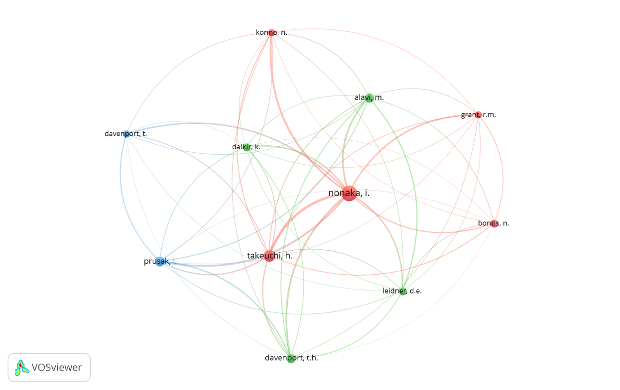 En la Figura 7 se puede observar que la cocitación de autores que han colaborado en obras sobre tema de modelos de gestión del conocimiento son: Nonaka, Takeuchi, Prusak, Davenport y Alavi. Los autores mencionados pueden ser considerados como los principales referentes en la temática considerada para este estudio, destaca Nonaka & Takeuchi donde enfatizan como todos los integrantes de una organización, sean internos o externos, estructuren conocimiento, generando así una memoria, es decir el conocimiento organizacional termina siendo la organización que aprende (Ulaf, 2015). Para esta creación de conocimiento ellos proponen el modelo SECI (Socialización, Externalización, Combinación e Interiorización), el cual permite el cómo se transfiere y se genera conocimiento tácito; se busca estructurar el conocimiento tácito para convertirlo en explícito; se requiere del uso de medios y herramientas de intercambio de información para generar más conocimiento explícito y este debe ser interiorizado y convertido en conocimiento tácito para usarlo entro de las labores organizacionales respectivamente (Barradas y Rodríguez, 2021).
