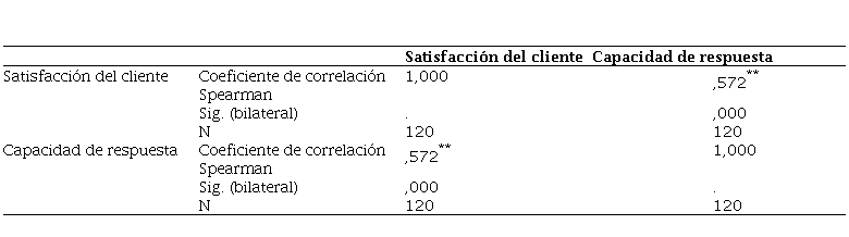 Por otro lado, se observa una relación moderada y positivas (Spearman r=0.572) entre capacidad de respuesta y satisfacción del cliente de la agencia Lima Centro de Caja Municipal de Sullana durante el año 2022. Del estudio resultó que la capacidad de respuesta es quien tiene mayor porcentaje en el servicio que no cubre la expectativa o exigencias del cliente teniendo algunas características como: tiempos de repuestas son muy prolongados ante cualquier consulta, reclamo, requerimiento o necesidad que el cliente pueda presentar durante la atención por falta de conocimiento del colaborador acerca del procedimiento o productos y no se llegue satisfacer al cliente. Se sugiere implementar un sistema que permita medir el tiempo de atención que se emplea con un cliente en la plataforma de atención y ventanillas de pagos con un máximo de tiempo adecuado para brindar el servicio. También, realizar un programa de inducción a todo el personal de atención al cliente en los manuales, políticas, procedimientos y productos con evaluaciones mensuales y seguimiento al personal.