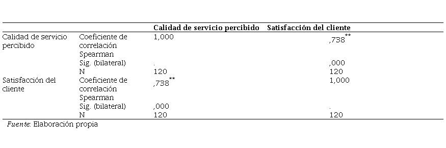 Todos los datos se procesaron utilizando el software estadístico SPSS V.26. La confiabilidad del instrumento se realizó mediante la prueba de Alpha de Cronbach obteniendo para la variable calidad de servicio percibido (0.921) y para la variable satisfacción del cliente (0.916) lo que demuestra muy buena confiabilidad. Para determinar la normalidad se empleó la prueba no paramétrica del coeficiente de Spearman donde el valor de significancia tanto en las variables y dimensiones es menor de 0,05 por tanto, se admite la hipótesis alterna y se deniega la hipótesis nula, es decir, se relaciona significativamente la calidad de servicio percibido y satisfacción del cliente. Luego de contrastar las hipótesis específicas en cada una de ellas, los resultados son menores a 0.05 aceptando las hipótesis específicas alternas y rechazando las hipótesis específicas nulas.