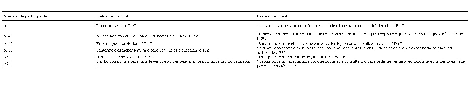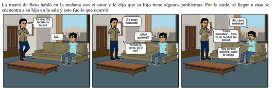 De las bases de datos elaboradas con los puntajes DERS, se compararon los resultados de los participantes del grupo 1 (altos), identificando los que disminuyeron en al menos tres puntos su desregulación emocional, es decir, mejoraron el uso de estrategias de RE. Los padres al observar y analizar la viñeta responden a preguntas como “¿Qué haría yo en esta situación?, ¿Cuál es mi emoción en la situación?, ¿Qué alternativa de respuesta buscaría? Esto, con la finalidad de poder observar cómo responden ante situaciones de estrés antes y después de adquirir un conocimiento acerca de conciencia emocional, estrategias para regular las emociones, técnicas de respiración para disminuir la intensidad y valencia. En la figura 1 se presenta la viñeta que los padres analizaron en la primera y última sesión.